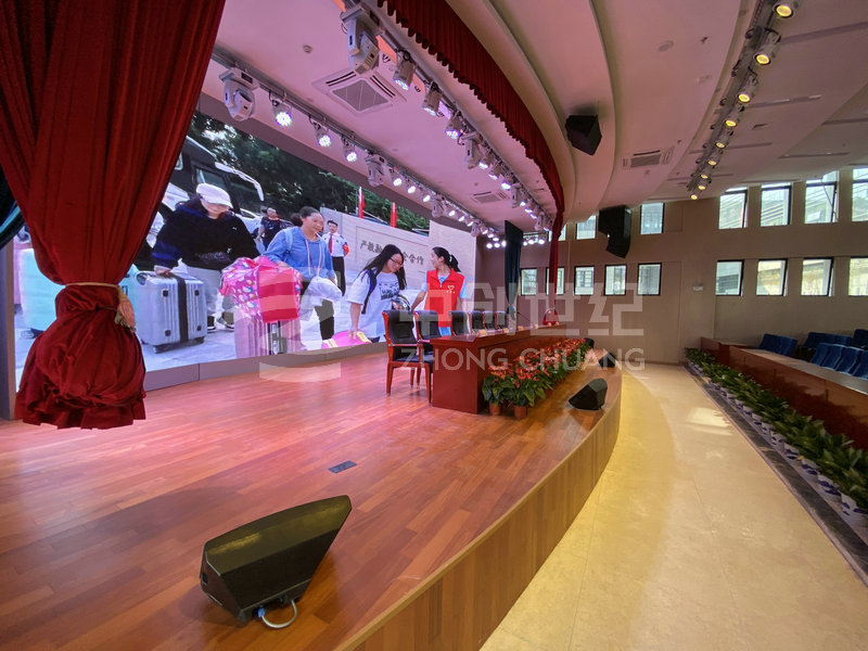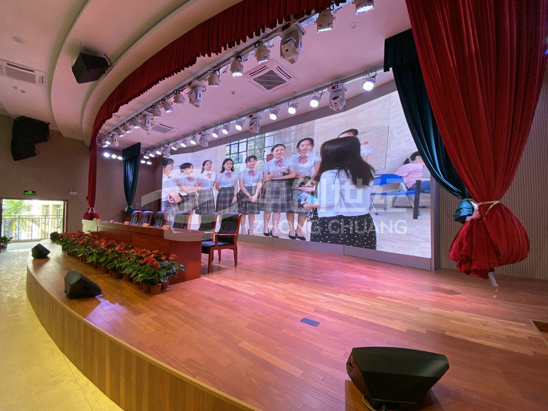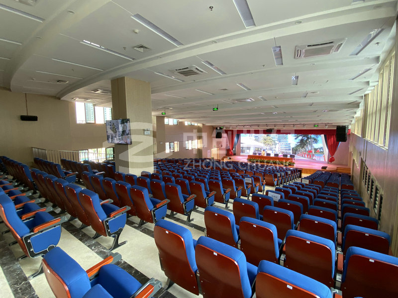深圳市福田區華強職業技術學校綜合樓禮堂觀眾區面積約2000平方米,其中寬約35米,深約55米,空高約24米,頂棚裝修后凈高約為27米。禮堂舞臺臺口寬約17.5米,高約5.8米,深約14.8米。