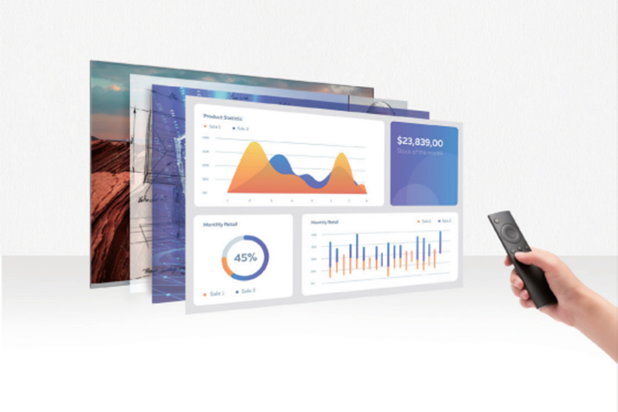 ④ 遙控控制,無(wú)線極速投屏:像操控一臺(tái)大電視一樣簡(jiǎn)單易用,可通過(guò)遙控器實(shí)現(xiàn)開關(guān)機(jī)、亮度/色溫調(diào)節(jié),內(nèi)容切換,上下翻頁(yè)等功能。支持電腦、手機(jī)、平板等設(shè)備投屏,多種設(shè)備同時(shí)在線操作,分享不受“線”制。