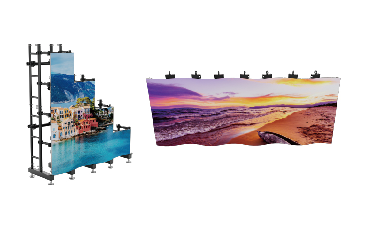 ⑥ 吊裝堆裝皆可,曲線依然:FL系列設計了小巧靈活的吊裝塊配件,以及前端帶有獨立連接片的專用配套支撐架配件,完美適配各種造型的弧形屏體安裝需求。